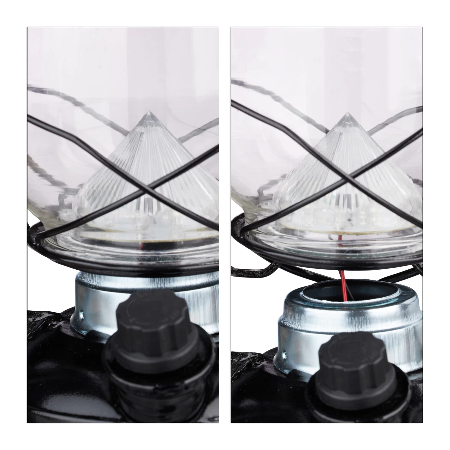 Diese schöne, detailgenaue Sturmlaterne zaubert ein gemütliches Ambiente auf Fenstersims und Terrasse oder spendet nützliches Licht auf der nächsten Campingreise. Im stilechten Öllampen-Design mit Glaskolben, Tragegriff und Rauchabzug wirkt die LED-Petroleumlampe nostalgisch und dekorativ. Dank Batteriebetrieb können Sie die Laterne einfach am Rädchen anstellen und dimmen und müssen nicht mit echtem Öl hantieren.