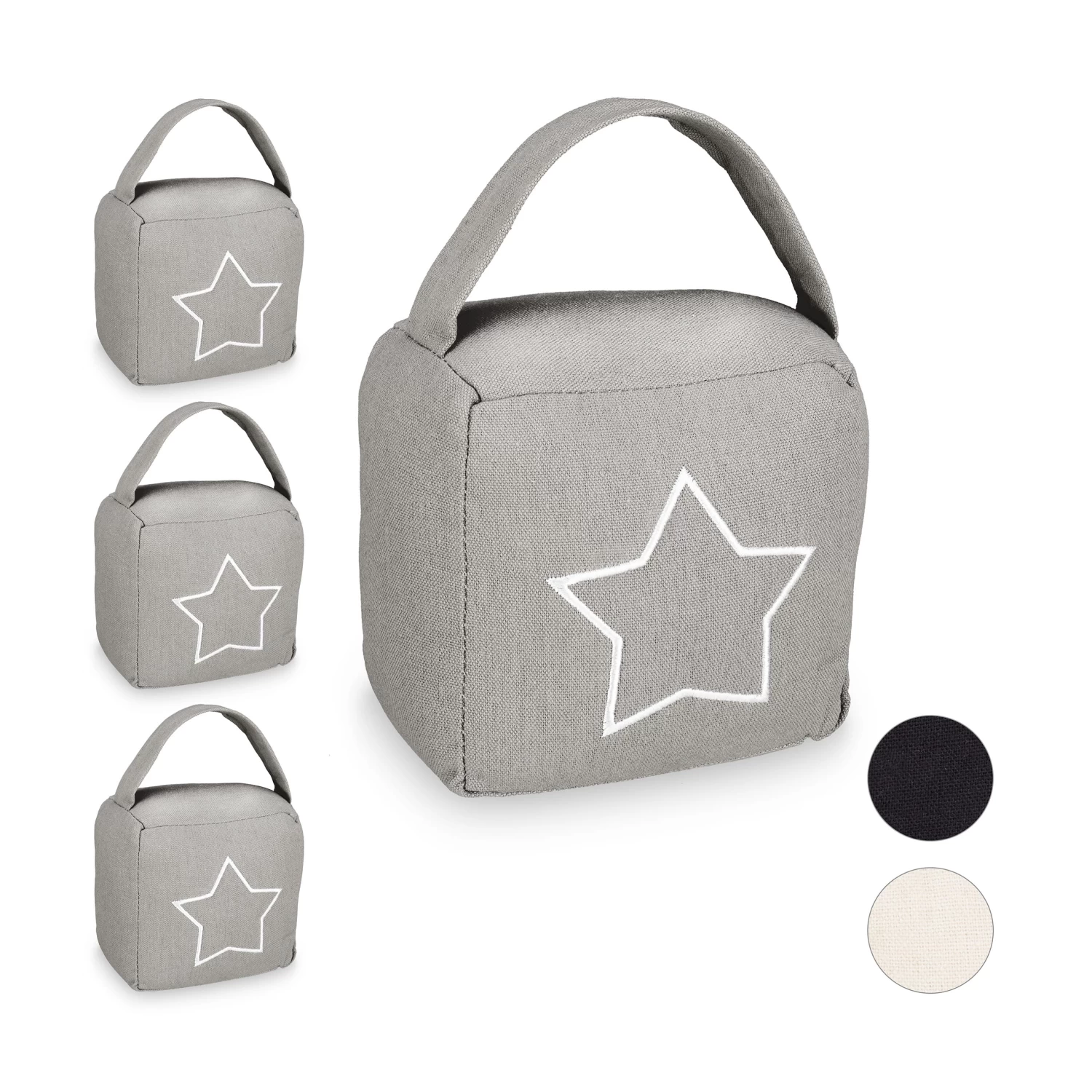 Der quadratische Türstopper aus Stoff überzeugt durch sein modernes Design mit einem dekorativen Stern auf der Vorderseite. Der Türpuffer muss nicht am Boden oder der Wand befestigt werden und kann durch den praktischen Griff einfach angehoben und jederzeit flexibel neu platziert werden.