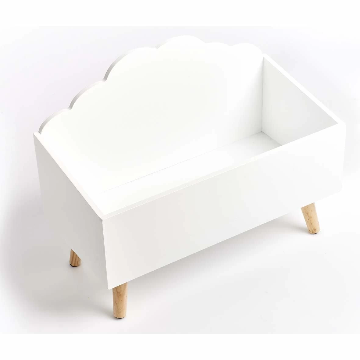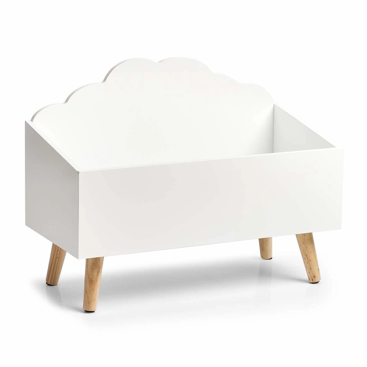 Moderne, schön präsentierte Spielzeugkiste ist im modischen skandinavischen Stil gefertigt. Es ist ein solides, stabiles und entzückendes Produkt mit seinem Aussehen. Vier Holzbeine vermischen sich wunderschön mit dem weißen Farbton der Wolke, deren Form einen Behälter hat. Die Box ist sehr geräumig und praktisch, wir können sie auf viele verschiedene Arten verwenden. Es wird alle Accessoires, Bälle, Spielzeug und Lieblingsgegenstände Ihres Kindes platzieren, so dass das Zimmer Ihres Kindes ordentlich ist.