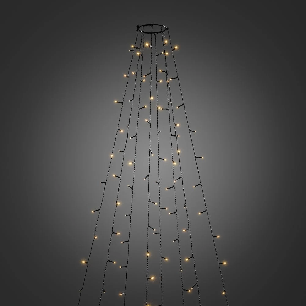 Jeder einzelne Strang ist dabei 2,40m lang und ist mit 30 bernsteinfarbenen LED bestückt. Jede zweite davon besitzt einen leichten Glimmereffekt, wodurch eine lebendige Beleuchtung entsteht. Einfacher einen wunderschönen Baum zu beleuchten ist praktisch nicht möglich. Die LED an dem Baummantel sind dabei bernsteinfarben, das Licht ist trotz LED nun endlich wunderschön gelblich warm.