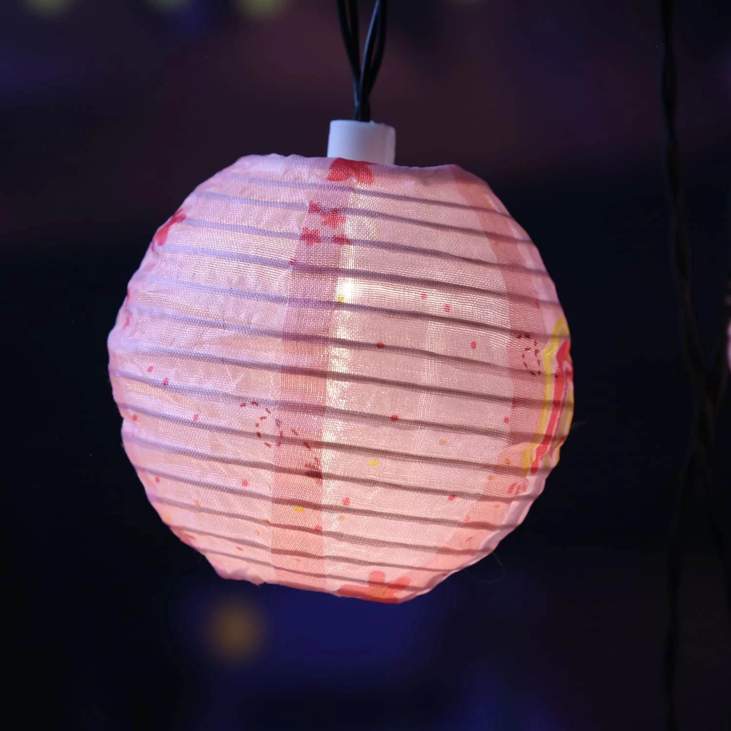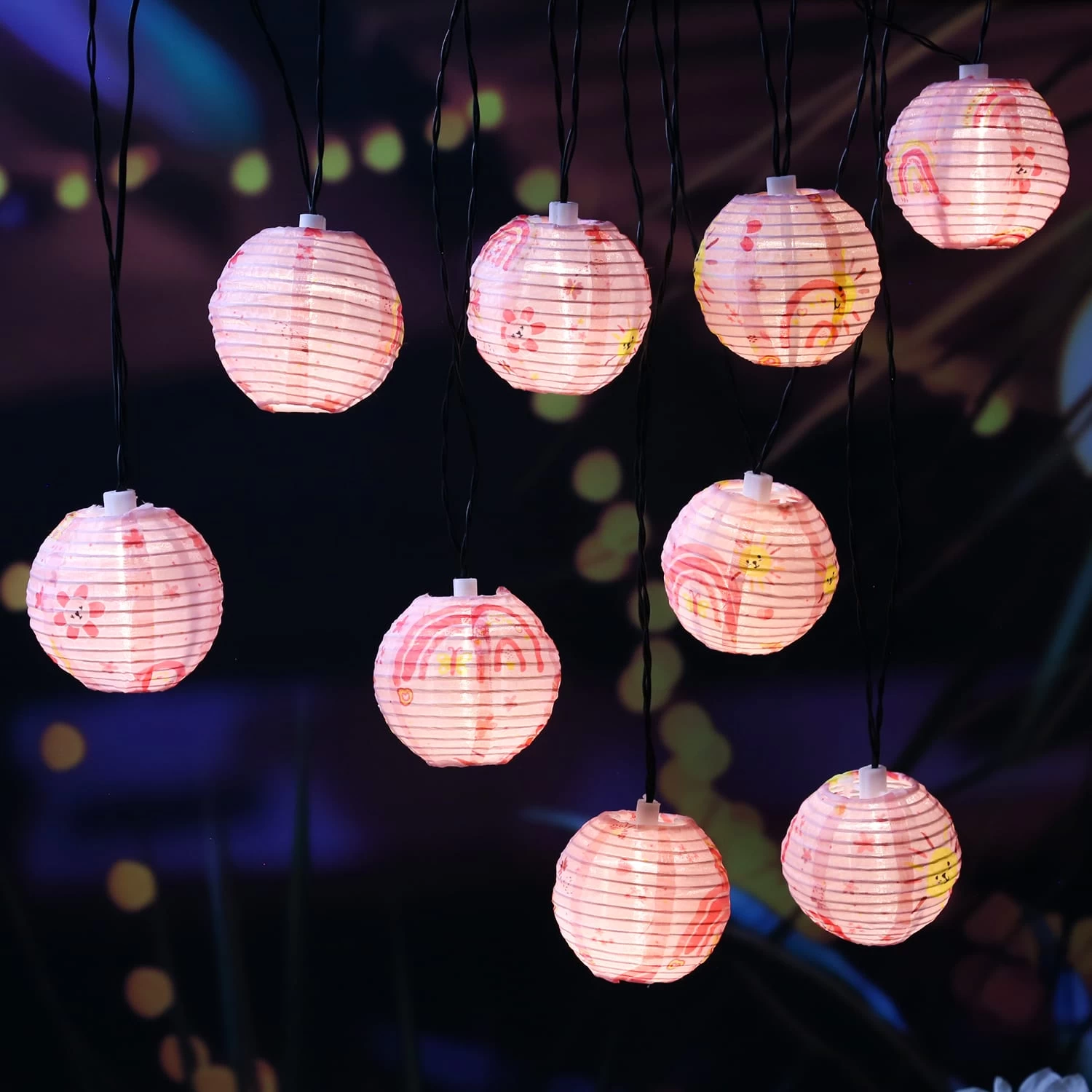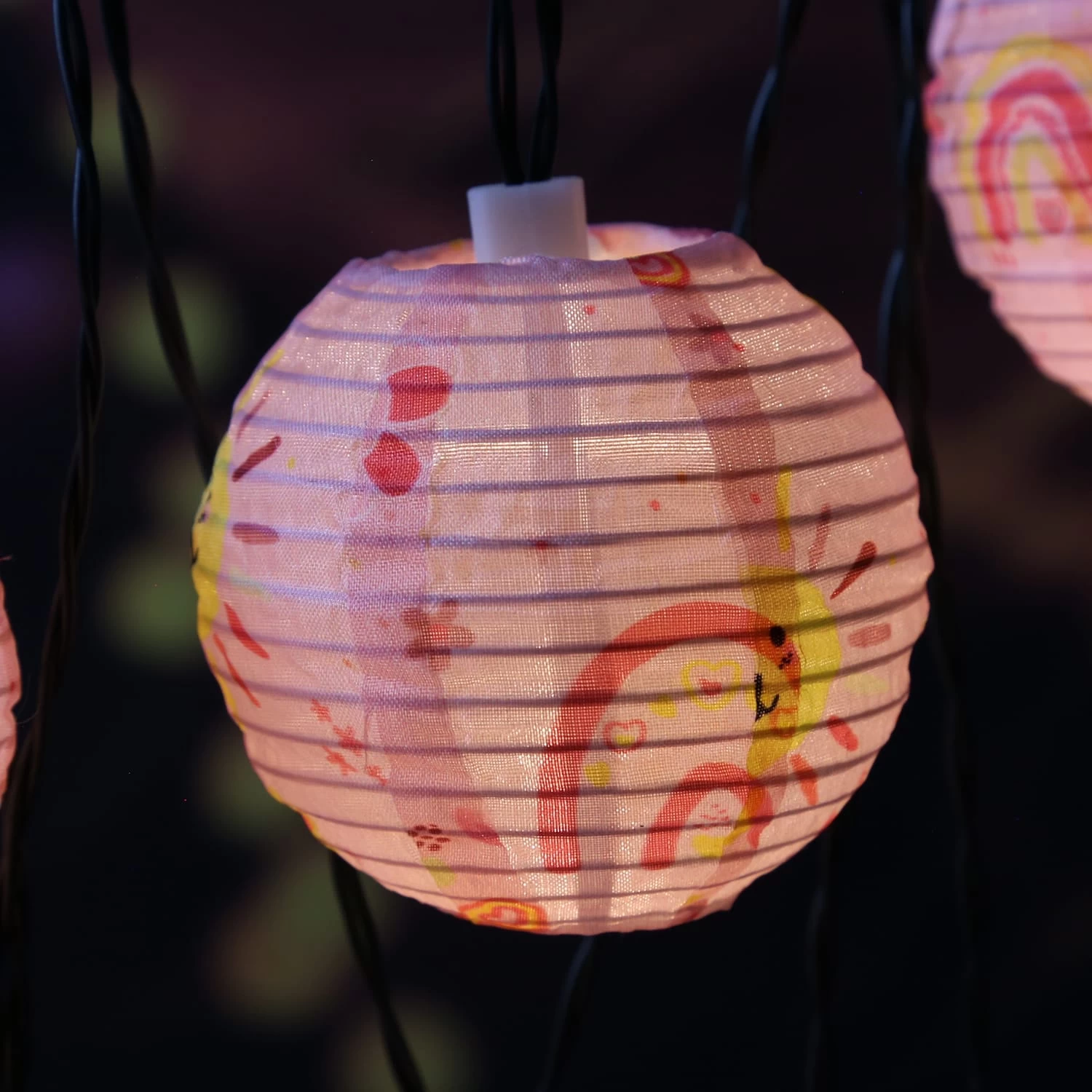 10 beleuchtete Lampions an Lichterkette mit Sonne und Blümchen als Motiv