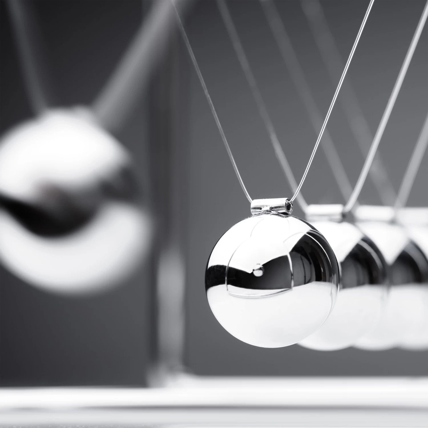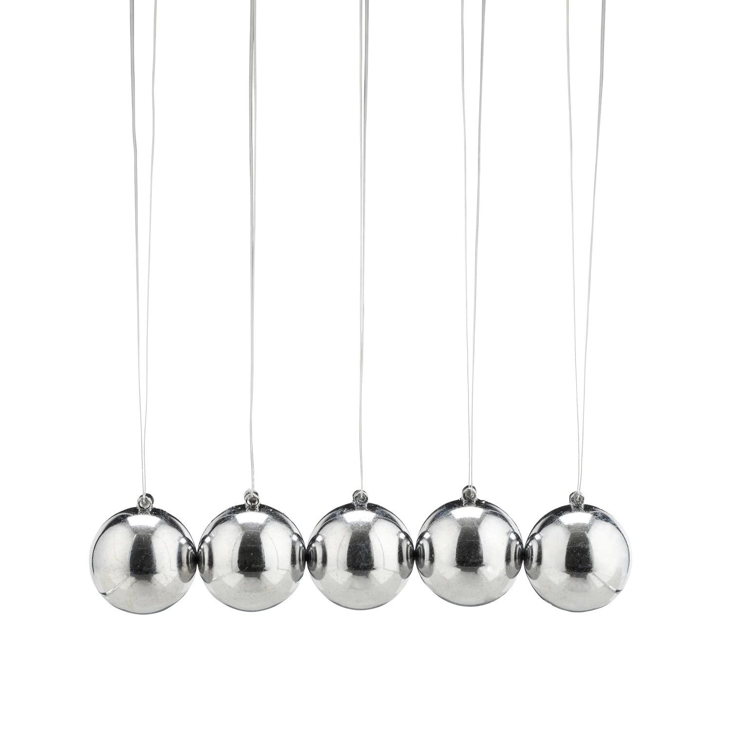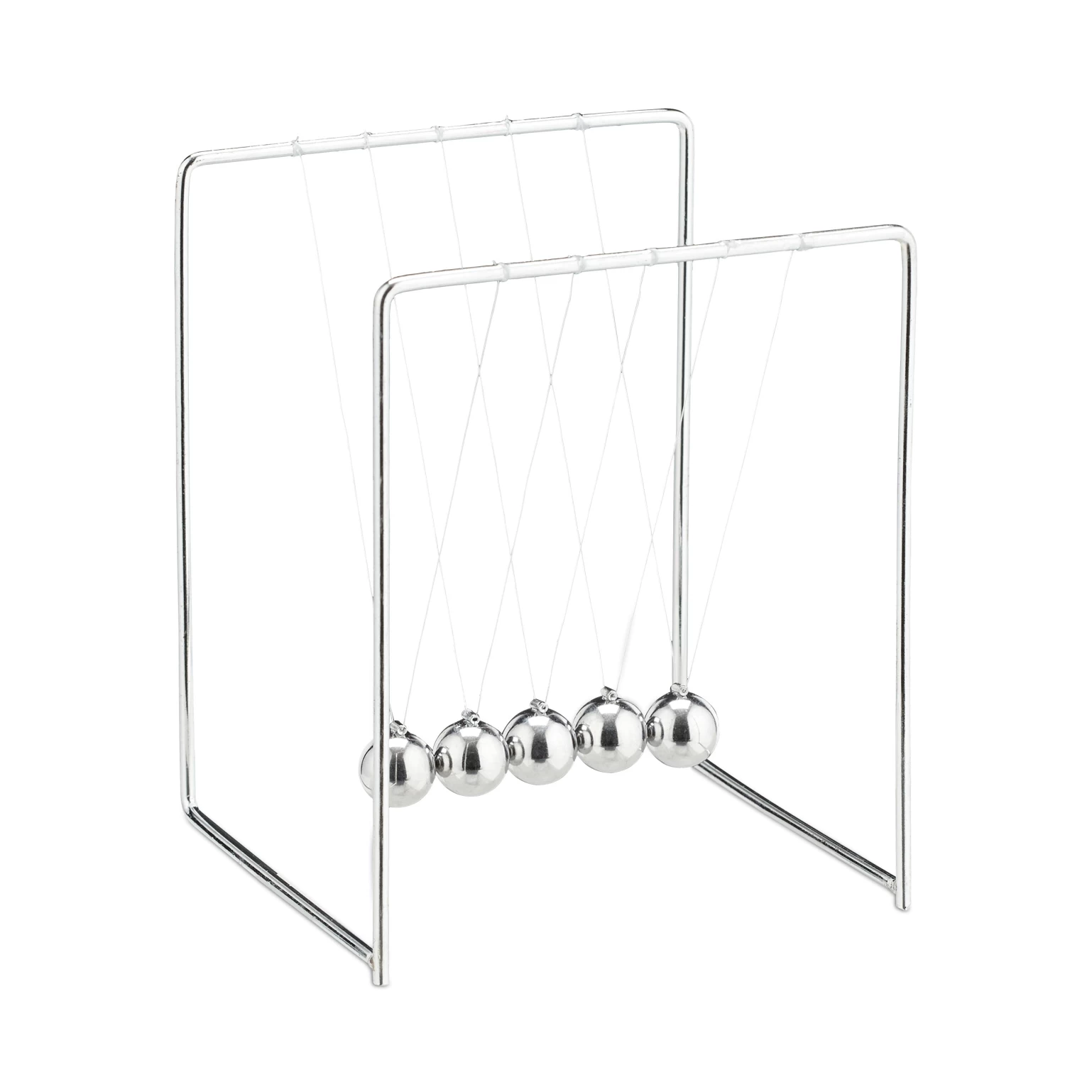 Das klassische Newton Pendel ist ein zeitloses und zugleich dekoratives Objekt für Ihr Büro oder den Schreibtisch. Die Funktionsweise des Kugelstoßpendels ist simpel und dennoch faszinierend: Lenken Sie eine oder mehrere der äußeren Kugeln aus – sobald sie an die ruhenden Kugeln stoßen, fängt auf der Gegenseite die gleiche Anzahl Kugeln an zu schwingen. Damit vereint Newtons Wiege Physik und Kunst auf spannende Weise und gibt interessante Einblicke in das Gesetz der Impulserhaltung.
