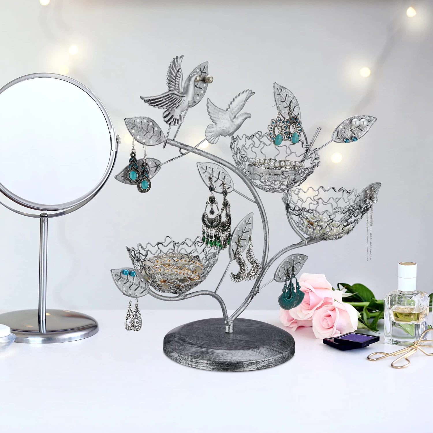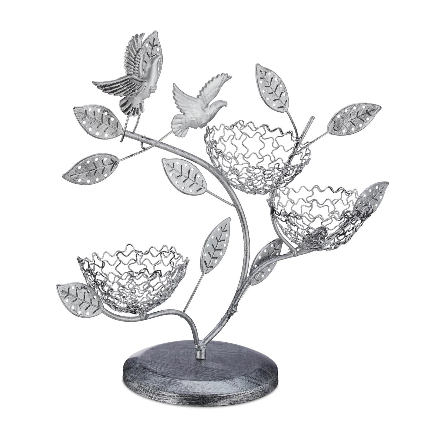 Mit diesem handgefertigten Schmuckbaum bewahren Sie Ihren Schmuck übersichtlich und geordnet auf. Die Schmuckhalterung bietet viel Platz für Ohrringe und -stecker oder auch Halsketten. In den integrierten Schalen finden zudem Ringe, Armbänder, Uhren oder Kosmetikartikel Platz. Die dekorative Vintage-Optik in Baumform mit Blättern macht den Ohrsteckerständer zudem zu einem echten Hingucker für den Frisiertisch und zu einer stylischen Präsentationsmöglichkeit für Ihren Lieblingsschmuck.