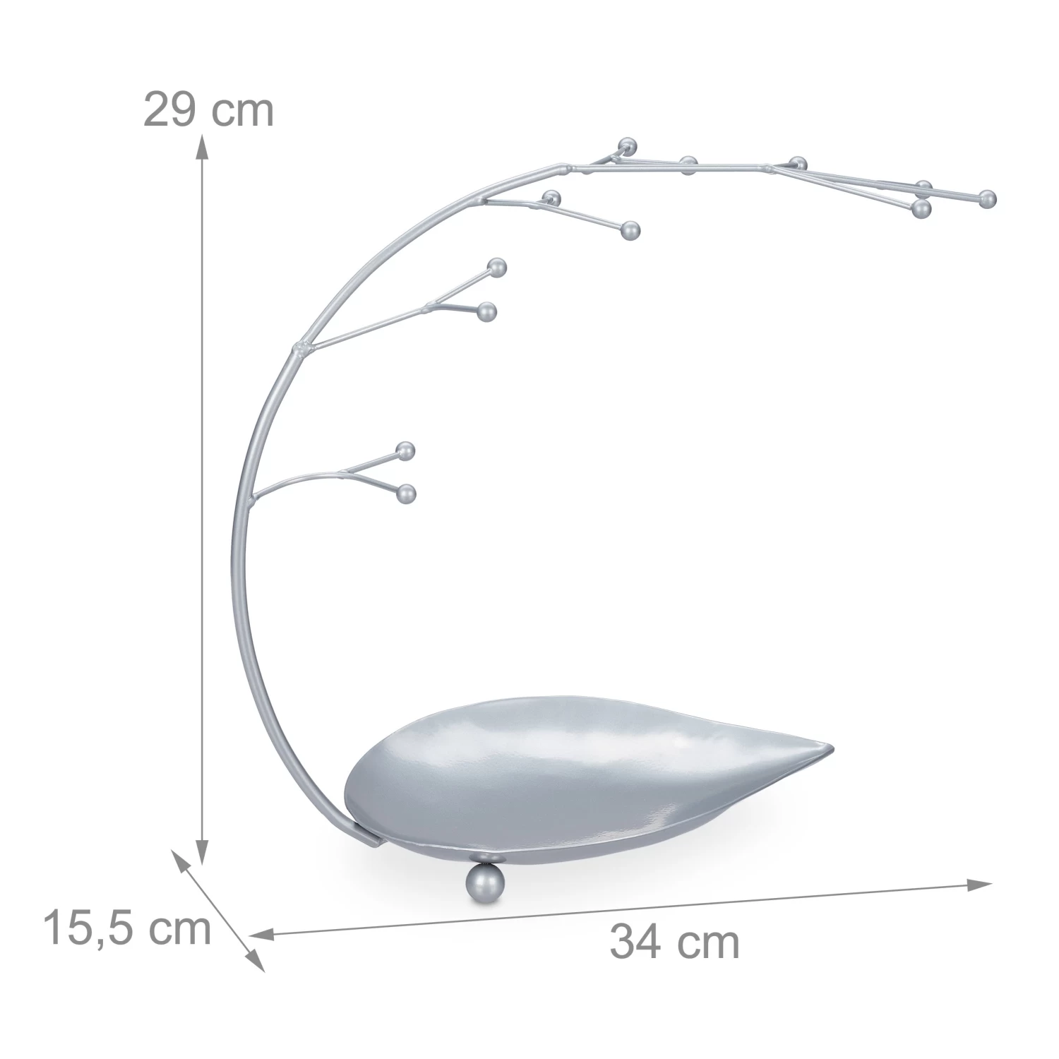 Mit diesem Schmuckständer gehören verhedderte Halsketten der Vergangenheit an. Der Kettenhalter bietet auf 12 Armen Platz für Halsketten, Ohrringe, Armbänder und -reifen. Auf der integrierten Schmuckablage lassen sich Ringe, Uhren und weitere Accessoires verstauen. Dank des naturinspirierten Designs mit Zweigen und Knospen und Ablage in Blattform wirkt der Halskettenständer besonders elegant und fügt sich dekorativ auf dem Schmink- oder Frisiertisch ein.