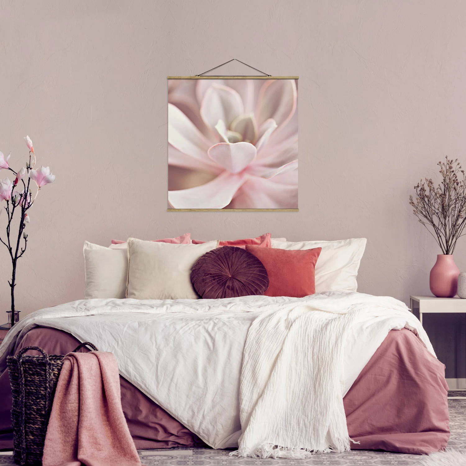 Stoffbild Mit Posterleisten – Rosane Sukkulentenblüte In Rosa