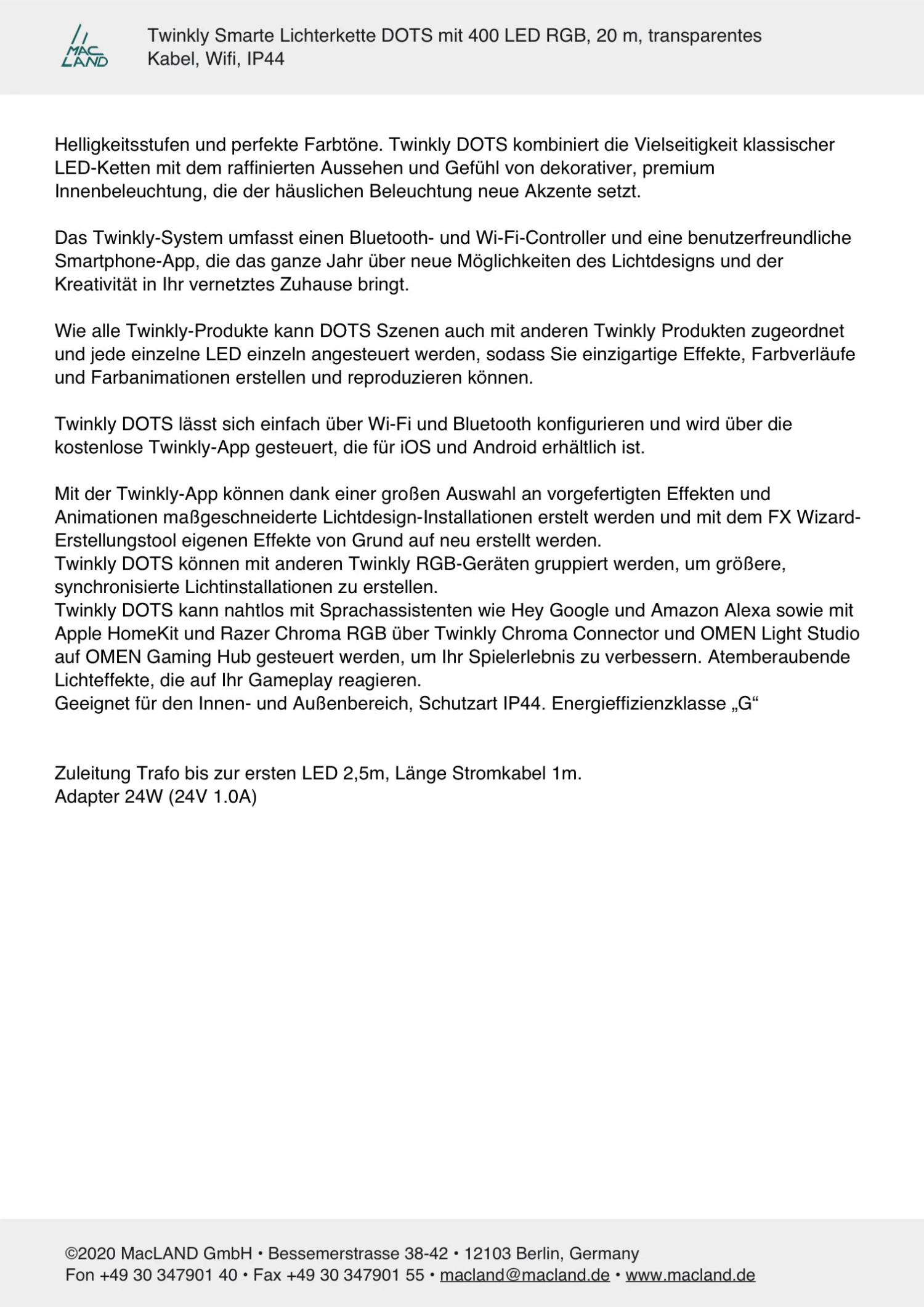 Mit einer beleuchteten Länge von 20 Metern und bestehend aus 400 RGB, 7-mm-LEDs, die speziell mit einem flachen, matten Kopf (4mm) entwickelt wurden bietet DOTS beeindruckende Helligkeitsstufen und perfekte Farbtöne. Twinkly DOTS kombiniert die Vielseitigkeit klassischer LED-Ketten mit dem raffinierten Wirkung von dekorativer, premium Innenbeleuchtung.