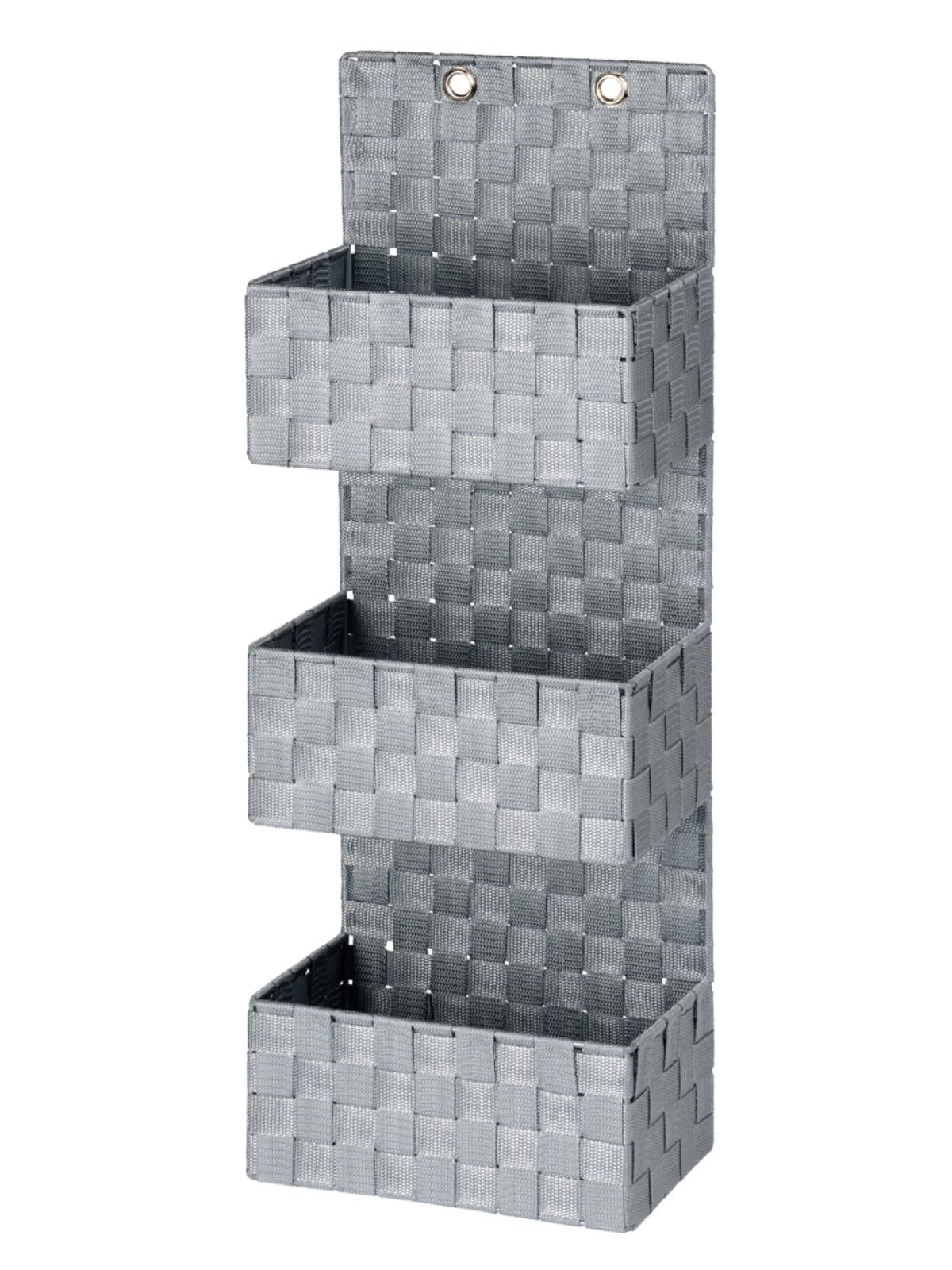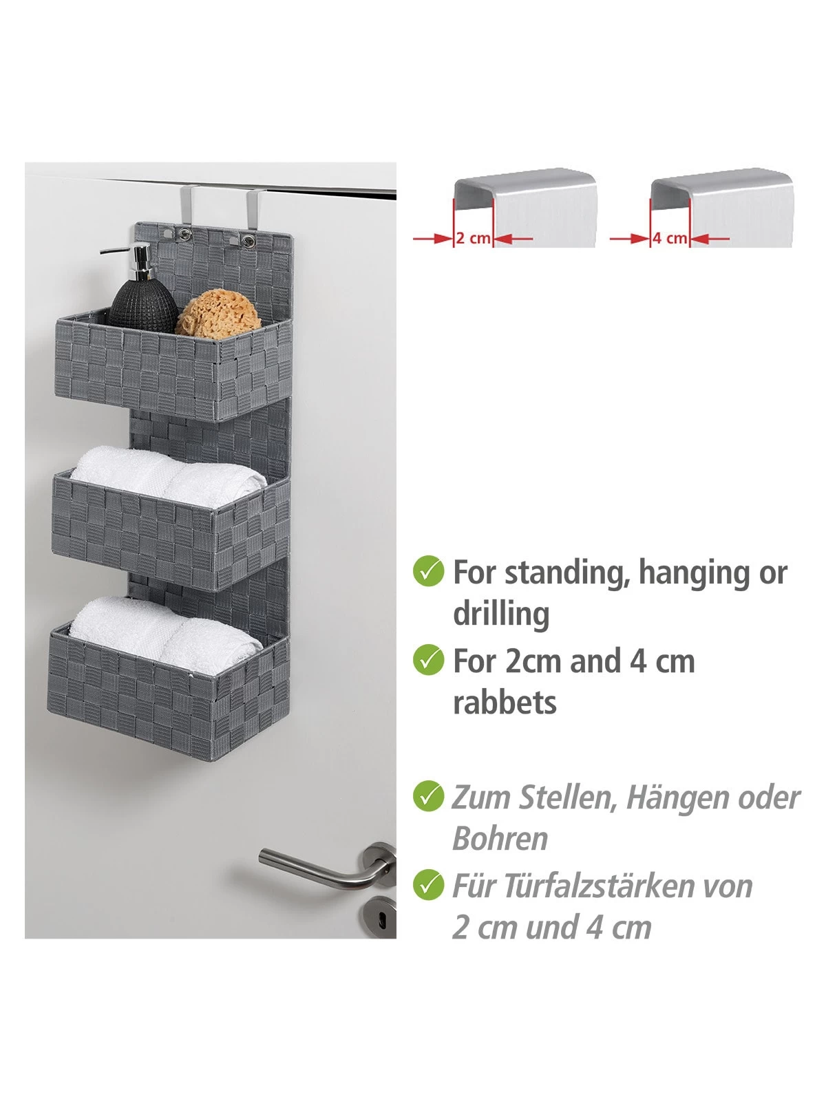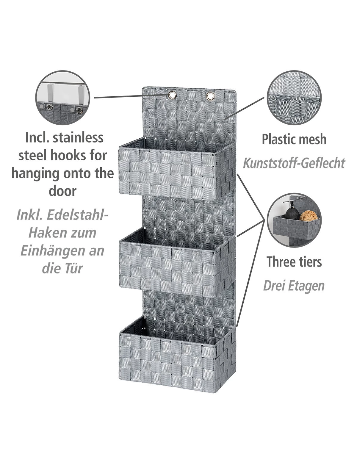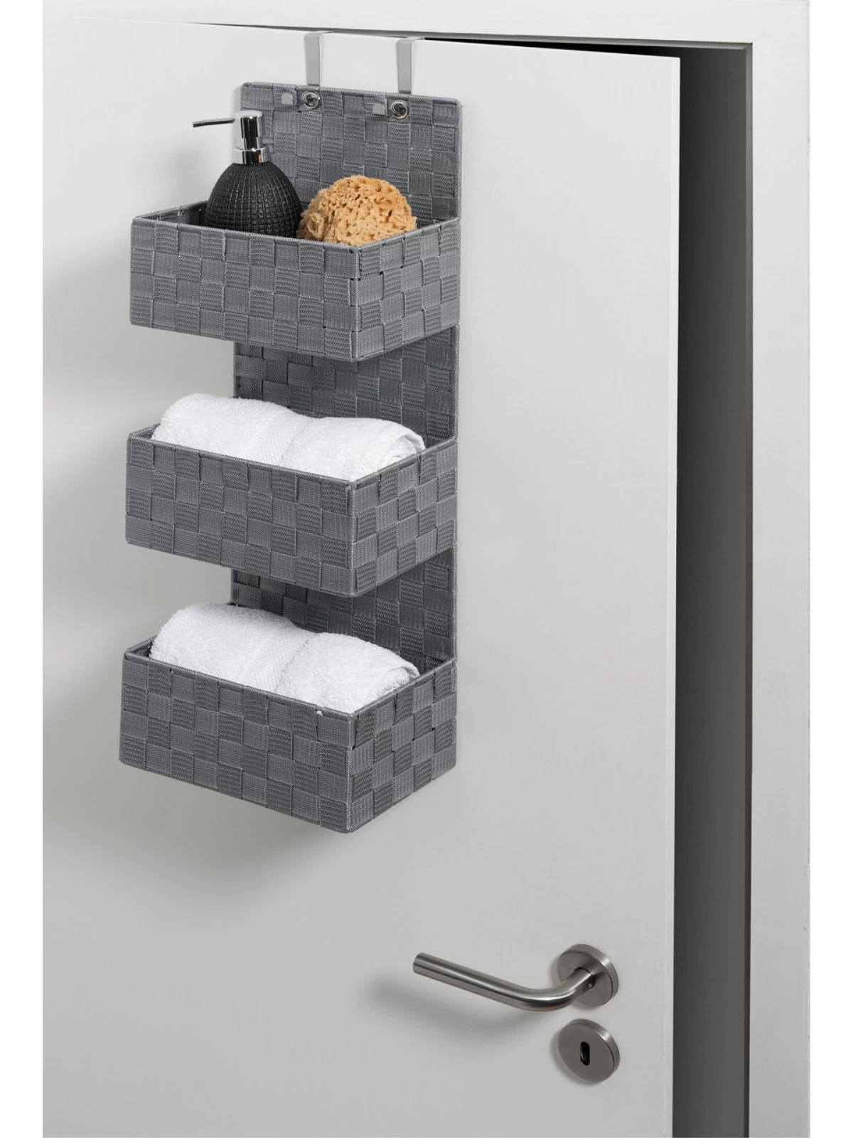 Der moderne Badorganizer Adria Grau macht Ordnungsproblemen ein Ende. Der clevere Helfer aus hochwertigem Kunststoff-Geflecht mit stabilisierendem Metallgestell bietet auf drei Etagen viel Platz und Übersicht für Spangen, Bürsten oder andere Badezimmerutensilien. Besonders praktisch: Der Badkorb lässt sich ganz einfach stellen, hängen oder an die Wand schrauben – Sie haben die Wahl.